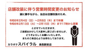 鳥取駅前店改装工事に伴う営業時間の変更のお知らせ